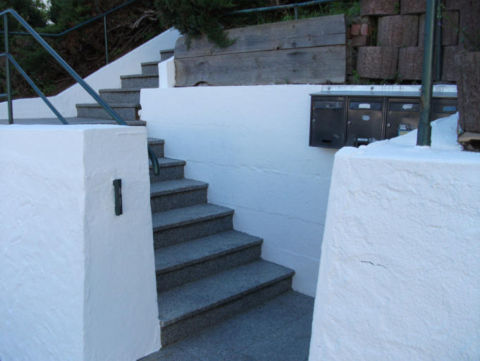 Treppen und Hauseingänge sowie schmale Gehsteige werden per Hand geschoben und abgestreut.